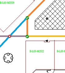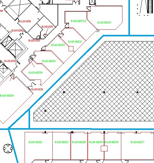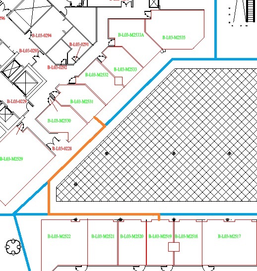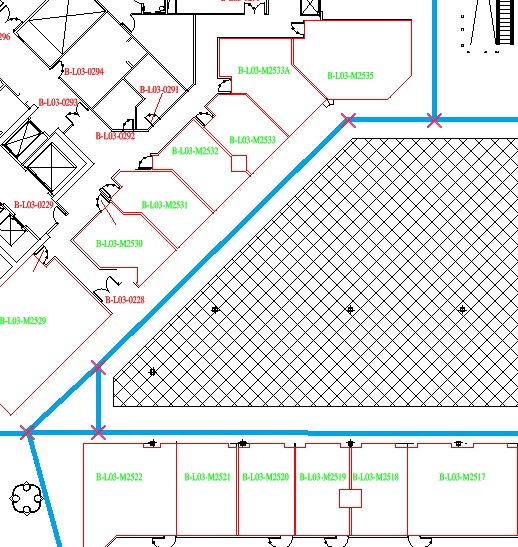 Blocking Lines are lines or polylines that walking routes cannot cross. These represent solid walls or areas that are out of bounds to customers, for instance, supply corridors. This is used to generate the line segment from the anchor point in the space to the nearest Corridor Line. Connections along Corridor Lines between Junctions are presumed to be using a door through any Block Lines.