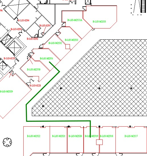 Walking distance is the distance it would take to walk in a usual manner from one point to another. It may navigate around corners, cross intersections, and utilize doors to exit rooms. In other words, it will measure the distance a typical person would need to travel from Point A to Point B. Usually, there will be multiple paths that could be followed, and CADViewer AutoXChange will compute the shortest distance from those alternatives.